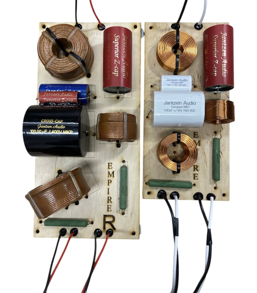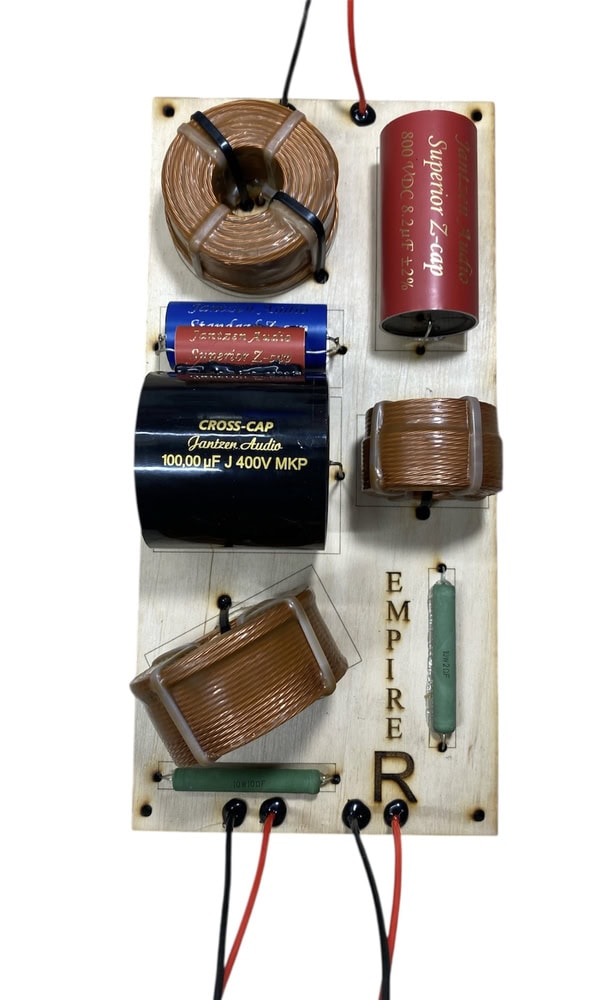 Výhybka je sestavena ručně v point-to-point topologii, aby byla signálová cesta co nejkratší a bez nežádoucích přechodových prvků. Použity jsou cívky typu Litz Wire zalité ve vosku pro potlačení skin-efektu a mikrovibrací. V signálových větvích se nacházejí fóliové kondenzátory Jantzen Standard Z-Cap a Superior Z-Cap s nízkým ESR a přesnou fázovou odezvou. Basová větev je doplněna o bypass kondenzátor pro rychlou impulsní reakci a přesný nízkofrekvenční přenos. Celek má vysokou mechanickou i tepelnou stabilitu, což zaručuje konzistentní výkon při jakékoli zátěži.